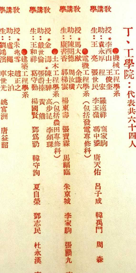 不久前,我从家里找到一份印刷红字的精美资料,上面写着“北京大學師生代表會議日程”,时间是1949年12月16日至18日,包括三天会议日程安排和参加會議的398位代表名單。其中,主席团成员共计36人,包括(以姓名筆画爲序、按原文抄录)牛廣業、王本茂、王雨若、王亮、王學珍、王寶光、古奇踪、向達、何耀坤、季羡林、胡傳揆、胡钟達、俞銘傳、馬大猷、袁良義、袁翰青、郝诒纯、格桑杨益剛(原件如此)、許德珩、陳織章、張鵬飛、黄熊、湯用彤、湯友竹、曾昭抡、程筱鹤、贾立人、杨傳纬、闻家驷、鄭天挺、鄭芝田、錢端升、譚元堃、羅常培、饒毓泰、顧瑋琳等。父亲黄熊作为优秀助教代表被推选为主席团成员,荣幸地与那些中国著名的教授和专家学者共同讨论新中国成立后的学校发展方向,探究如何培养和造就社会主义高等教育人才,教授们深思熟虑的发言让父亲受益匪浅。