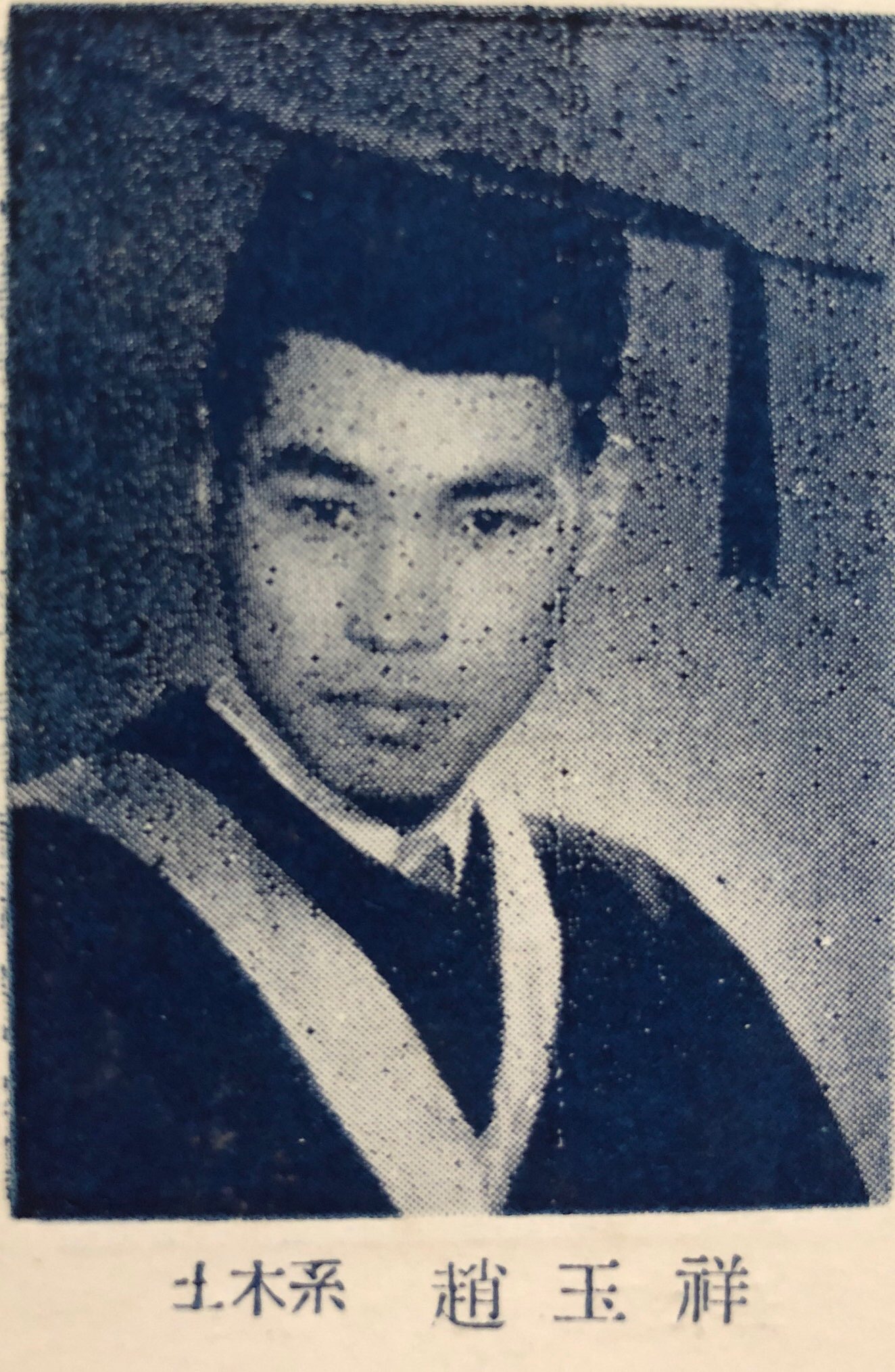 赵玉祥,徐州市人,1916年1月生,早年上过私塾,江苏省第十中学(徐州一中前身)毕业。为了将来有活干,有饭吃,他1937年考入西安西北工学院,后因日寇南侵,陇海路不通,无法返校,学业便中断了。他还想上大学,但家庭困难,学费太高。1940年,他多方打听,清华大学学费500元,北京大学只要100元,便报考了北京大学,进土木工程系学习,这个系里多数是穷学生。