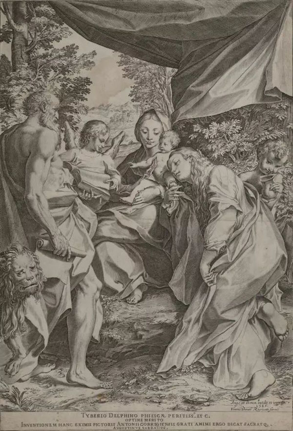 阿戈斯蒂诺·卡拉齐(1557-1602),《圣母与圣婴,麦格达伦的玛丽亚和圣·杰罗姆》,铜版画,1586年,来源于帕尔马博物馆的一幅科雷乔的画作。