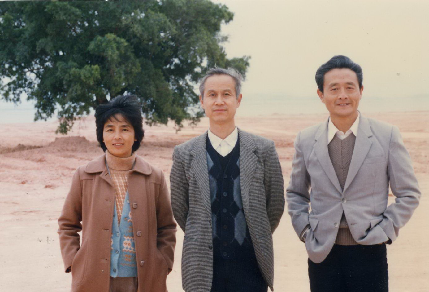 1987年陈难先(中间)与乔树德(右一)、沈赛赛副校长(左一)踏勘育才二小校址。为了身后那棵大榕树能够进入二小校园,用地红线特地外移。