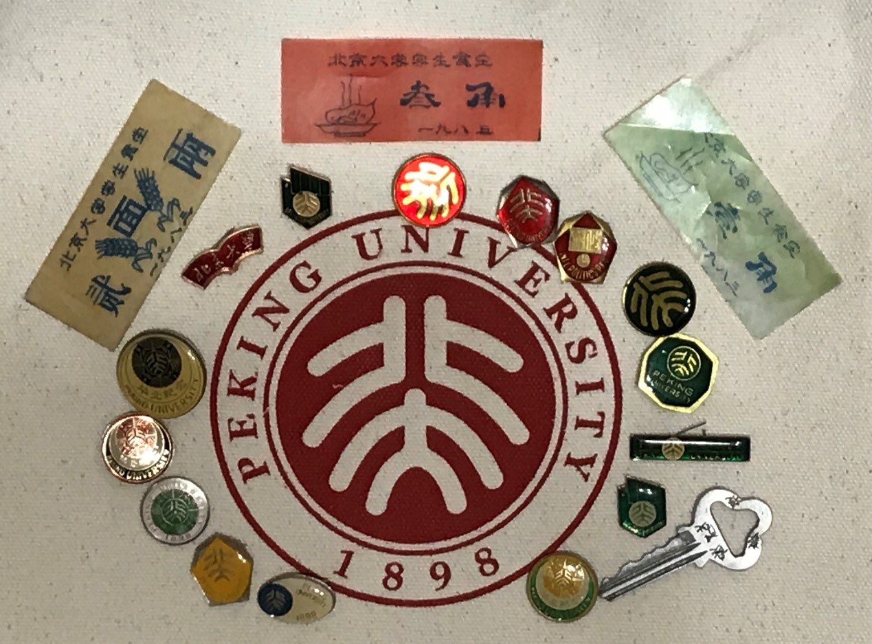 刘晓春在北大读本科时的北大纪念章、饭菜票和宿舍钥匙
