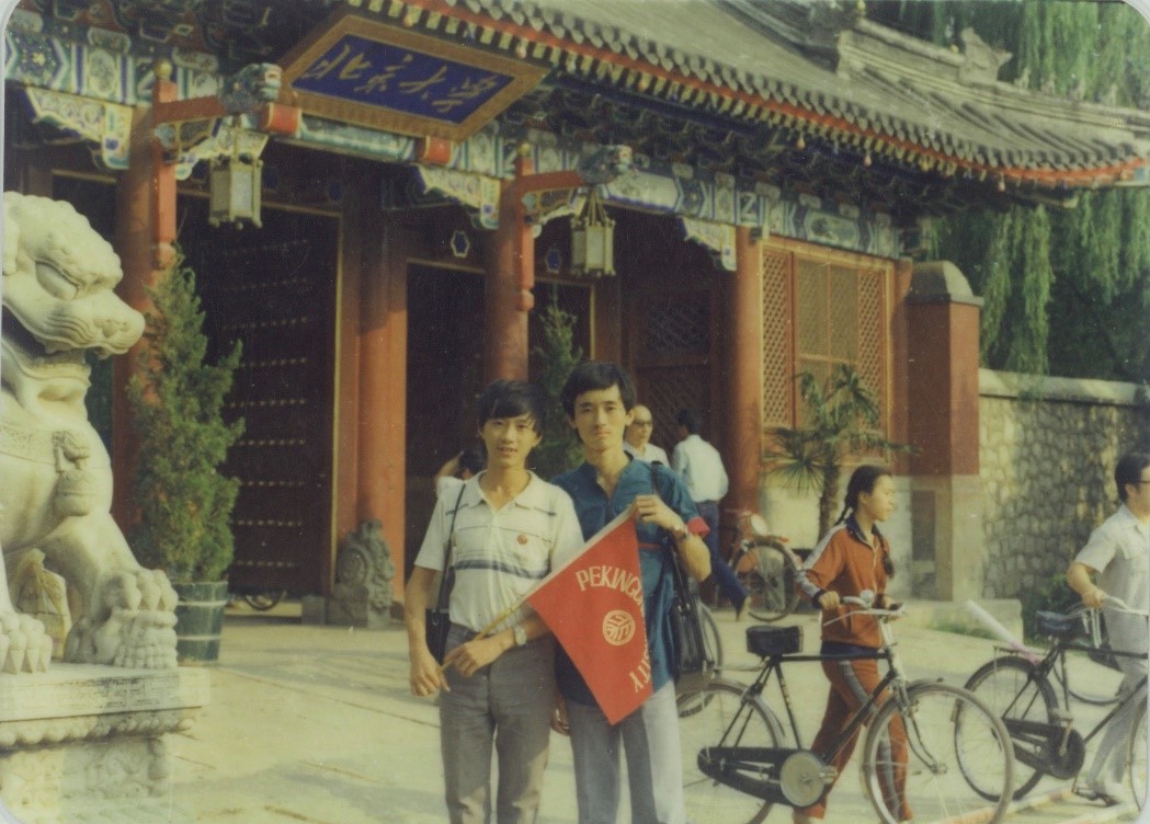 1987年西校门,刘晓春(左一)由其已从北大经济学院毕业留校工作的哥哥刘晓东领进北大