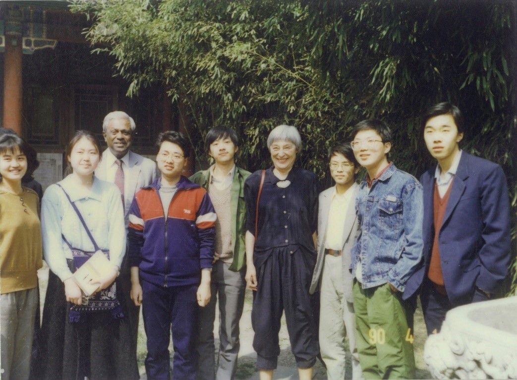 1990年,刘晓春(左五)作为北大学生代表与著名英籍华裔女作家、燕京大学校友韩素音在燕园临湖轩对话