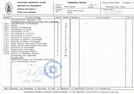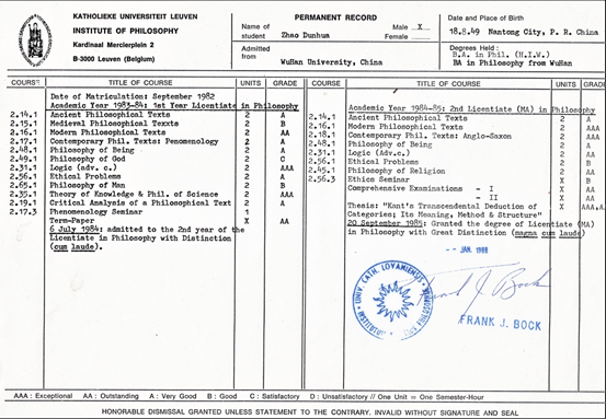 在鲁汶大学,凡是外国留学生都要先读one year BA,才能进入硕士项目。第一年学习16门课程对语言尚有困难的赵敦华是个难关。