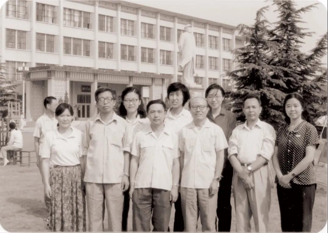 1970年代末,谢冕与同事、学生在北大图书馆前合影(前排右二为谢冕)