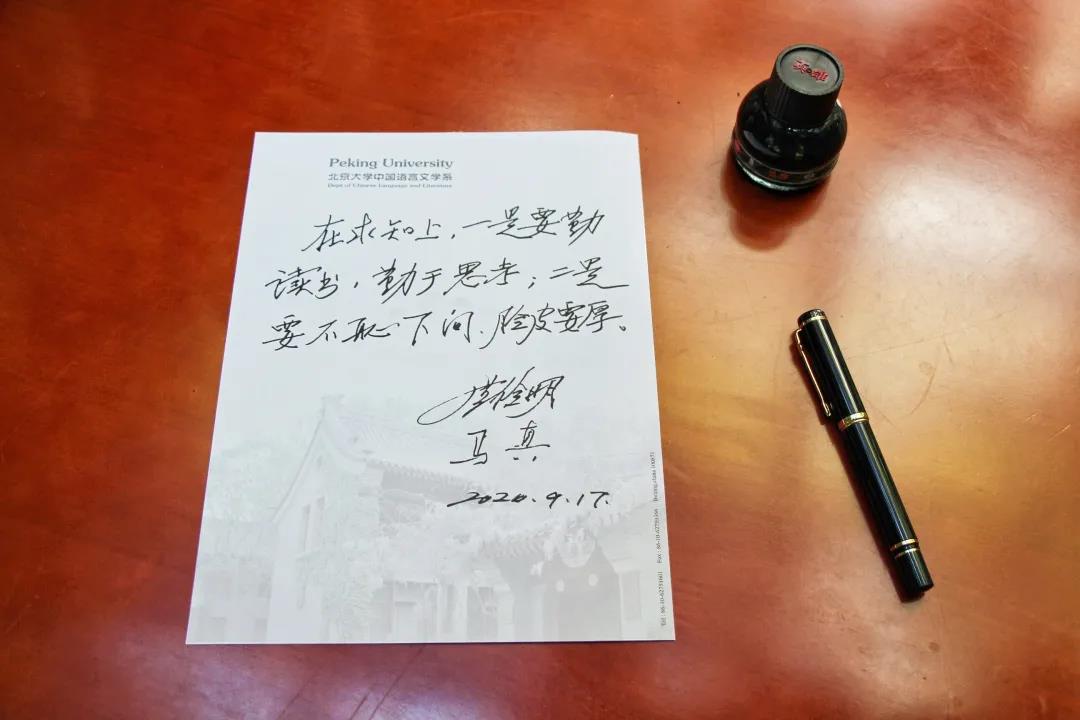 陆俭明、马真题词:“在求知上,一是要勤读书,勤于思考;二是要不耻下问,脸皮要厚。”