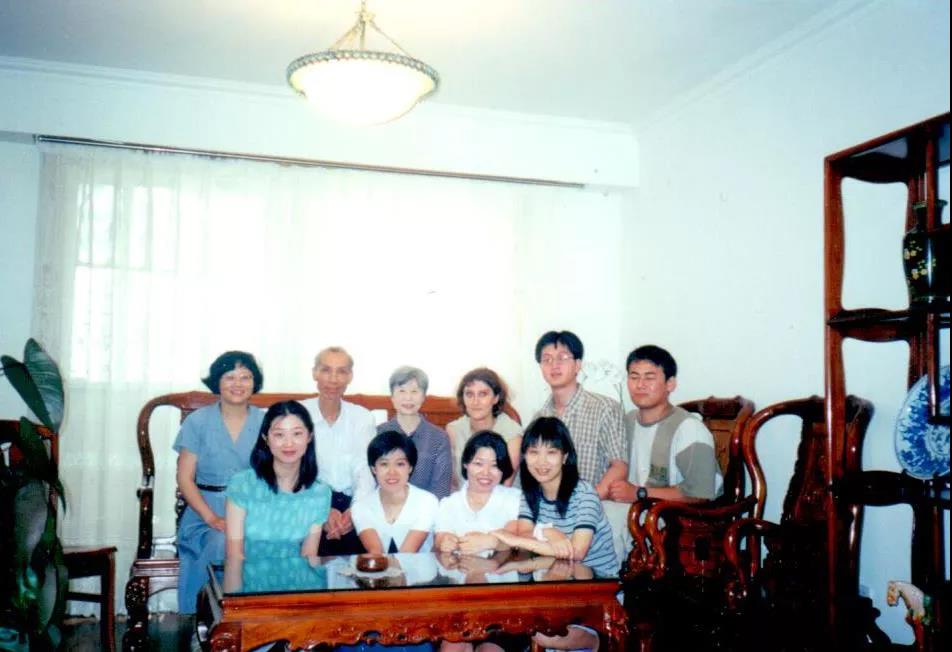 2001年6月,陆俭明、马真与来家中探访的学生们合影