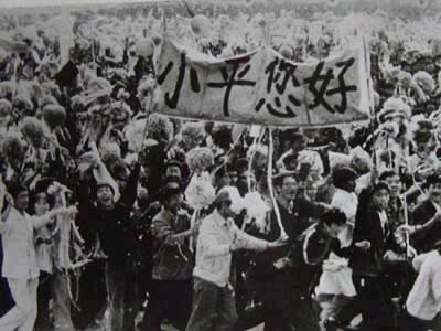 这个建议得到大家一致赞同。“横幅就写改革加速、教育改革吧。”有同学立刻提议。但是,大家觉得这些内容虽然好,却不能充分表达大家对国家的热爱之情,特别是对领导人小平同志的感激之情。