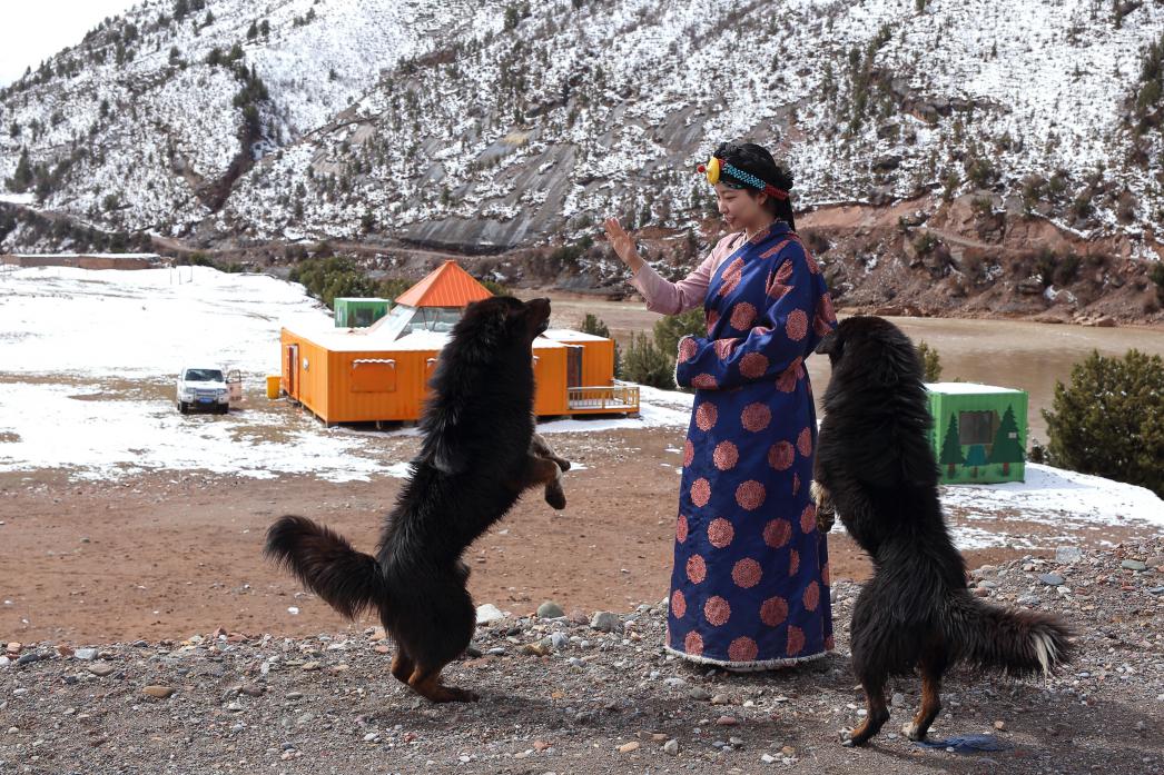 李雨晗和经常去工作站拜访的藏獒“大白”“二白”,他们身后就是橘红色的工作站 徐振辅 摄
