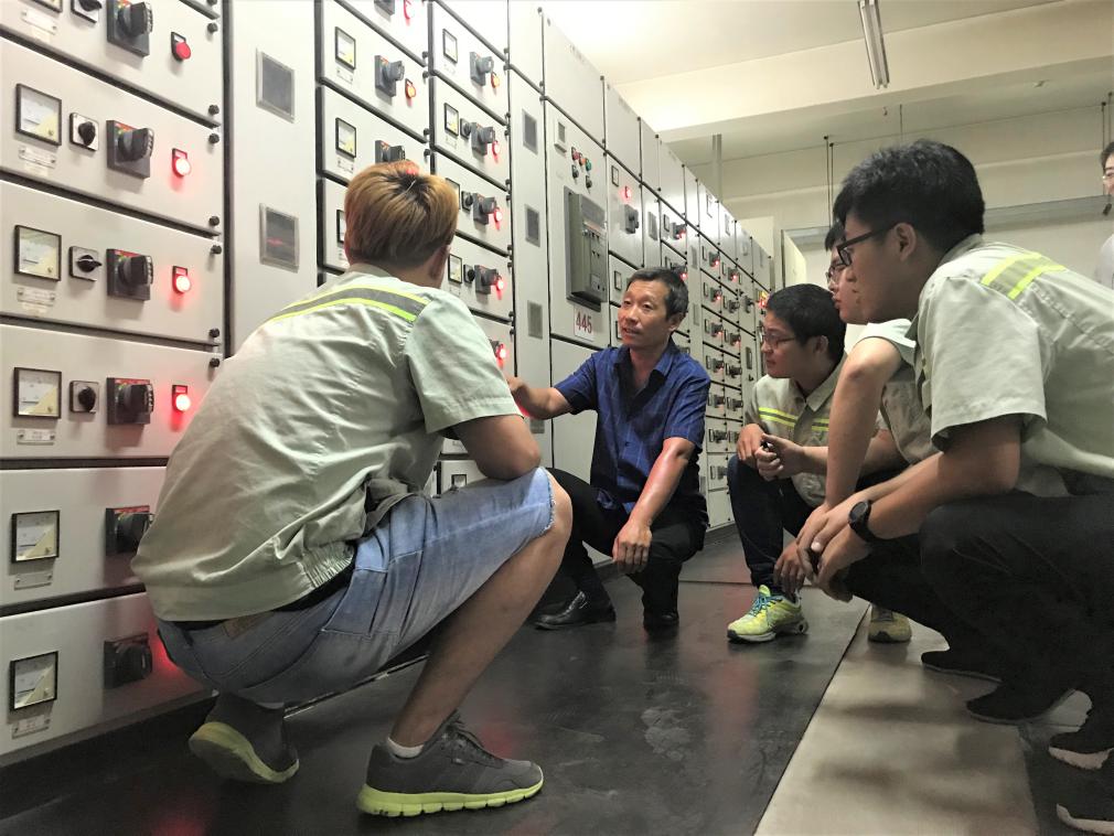 在二教配电室,王源与同事查看了解供电设备运行情况