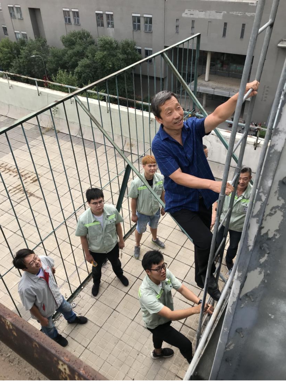 理教4层到2层平台的高空卷帘门约12米,今年暑假检修时,几个小伙子在很高的脚手架上行动自如,像表演惊险的杂技。电梯需要定期维护保养,前期也偶尔出现故障,王源接管此项任务后,把物业管理转变成主动性的服务,小故障随时处理,主动维修,在老师同学发现之前就先去解决。