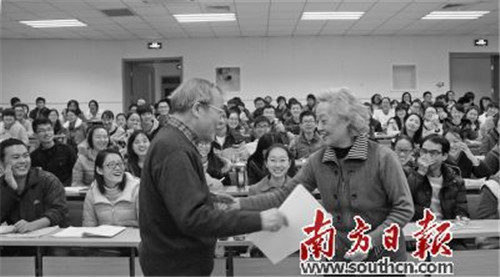 年事已高的教授站在三尺讲台,白发苍苍的妻子紧紧相随,这样一对学术伉俪的出现像一剂强心针,让人们又看到了学术之荣耀,亲情之光芒。
