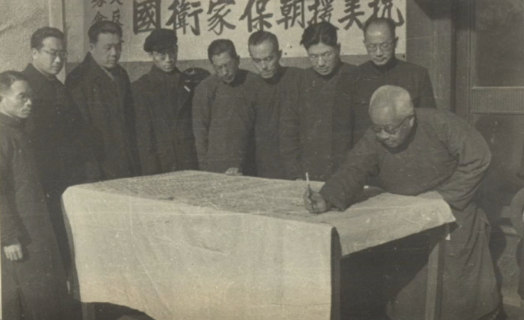 11月6日,北京大学发布《本校全体教职员工学生拥护各民主党派联合宣言的通电》,保证以各种积极有效的方式为抗美援朝保家卫国的神圣任务而奋斗。在北大档案馆有关抗美援朝的照片集中,有两张照片记录了当时北大教职员在现场签名拥护各民主党派联合宣言的真实场景:在北大反侵略委员会《抗美援朝保家卫国》宣传横幅的映衬下,每一位教职员的表情都是严肃而坚定的,怀着对新中国的热爱、对抗美援朝的支持而郑重签字。
