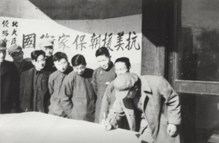 在北京大学档案馆的馆藏珍品中,有一卷题名为《北大抗美援朝的有关照片》的声像档案,打开尘封的历史画卷,那是1950年秋北大教职员聚集在一起、签名拥护各党派联合宣言的场景。