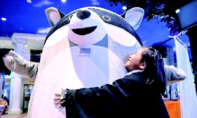 在国际罕见病日到来之际,罕见病卡通形象“罕熊”走上北京街头与人们拥抱。“罕熊”是病痛挑战基金会2019罕见病科普宣传活动的罕见病卡通形象,它通过短视频、网络传播、落地活动等互动形式,让公众增加对罕见病和罕见病群体的了解。图为一名小朋友与“罕熊”拥抱。
