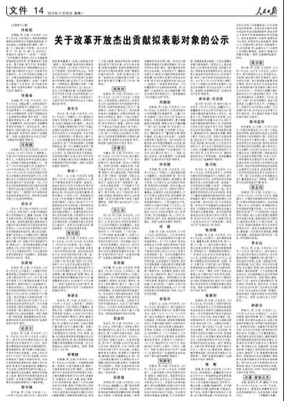 今天,中央庆祝改革开放40周年表彰工作领导小组办公室,通过《人民日报公示了一份重磅名单——为庆祝改革开放40周年,党中央决定表彰一批为改革开放作出杰出贡献的个人
