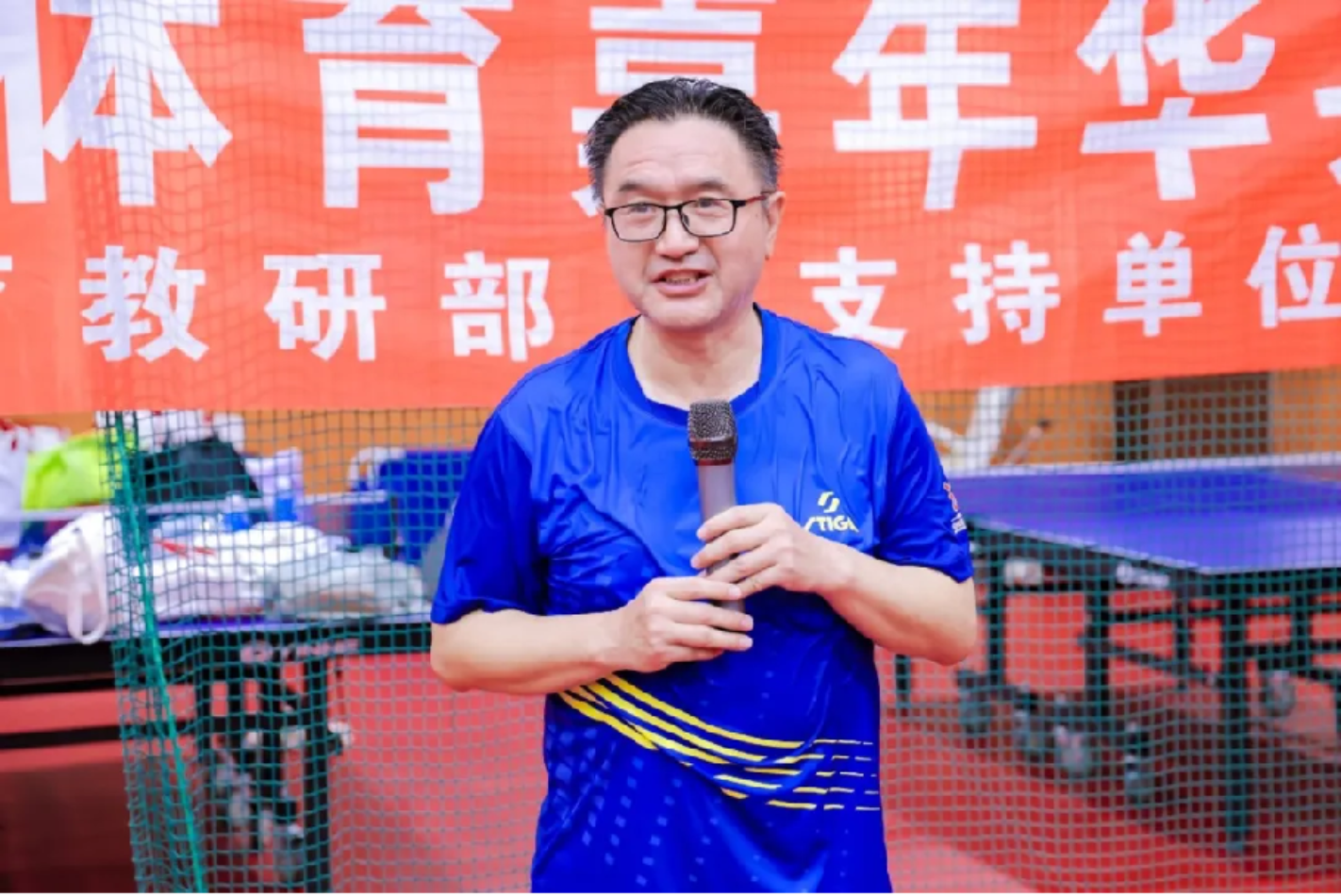 校友赞助单位代表、北大法学院校友、北京蓝石律师事务所主任何胜文发言。他对本次校友乒乓球联谊赛的举办表示祝贺,对到场嘉宾、裁判团队及工作人员表达感谢,并预祝本次比赛取得圆满成功。