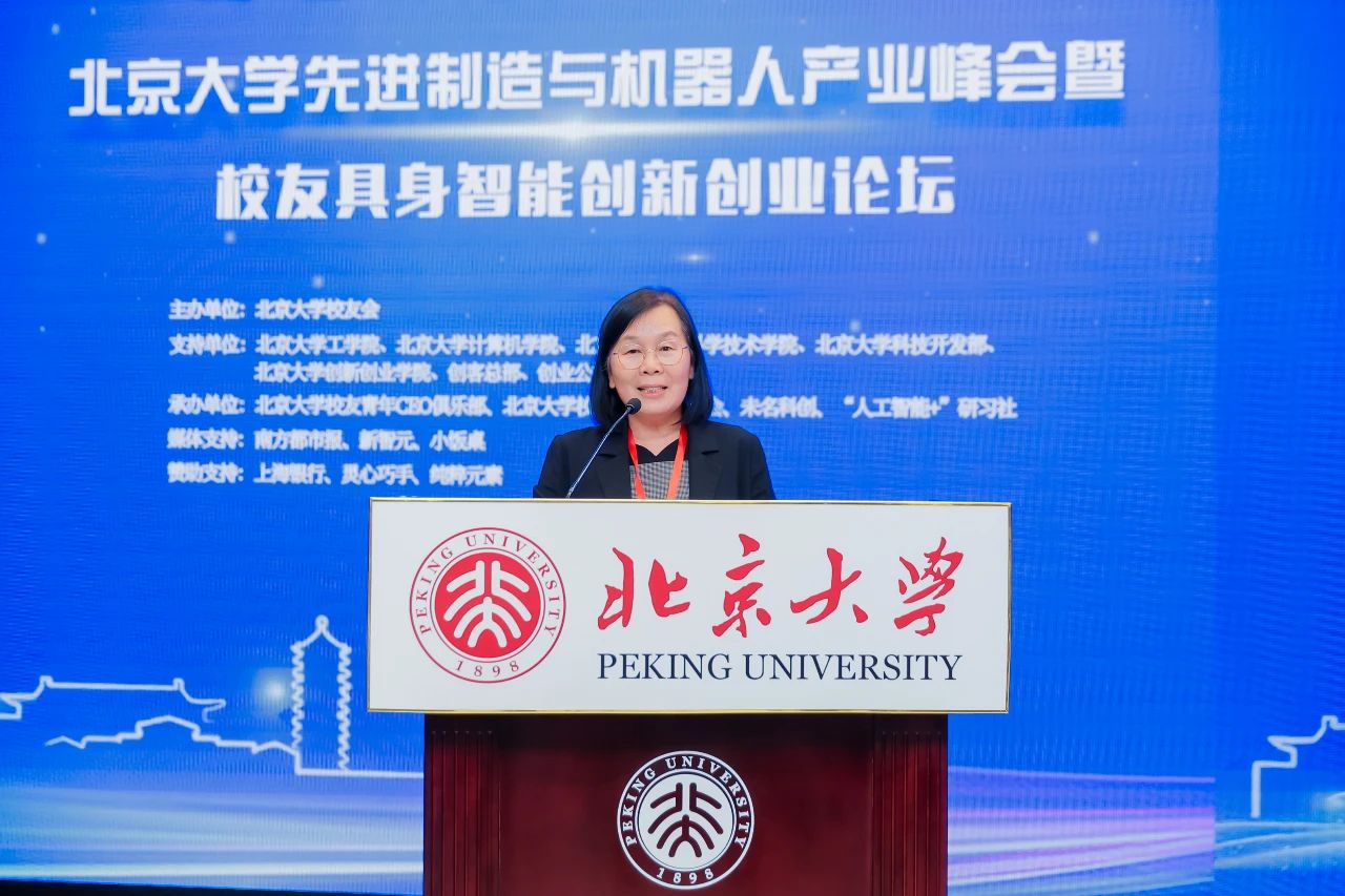 中国科学院院士、北京大学博雅讲席教授、北京大学工学部主任、工学院院长段慧玲回顾了北大工学百年底蕴与新工科布局,提出工学部将聚焦跨学科融合与产学研协同,解决“卡脖子”技术难题。她表示,先进制造与机器人学院将推动智能技术从“技术可行”向“商业可行”跨越,并寄语校友成为产业变革的“破壁者”。