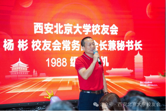 杨彬欢迎了新校友加入大家庭,并向在场新老校友介绍了西安北京大学校友会整体情况,他先回溯了校友会发展脉络:自1984年陕西北京大学校友会初建,至2001年正式注册在西安市民政局登记注册为“西安北京大学校友会”,迄今已形成完善组织架构。他详述三千余会员规模、理事会组成、历任会长及品牌活动,强调校友会始终是校友的坚实后盾与职业发展平台。致辞收尾,他引李白诗句激励全场“愿诸位持守燕园初心,长风破浪会有时,直挂云帆济沧海!”