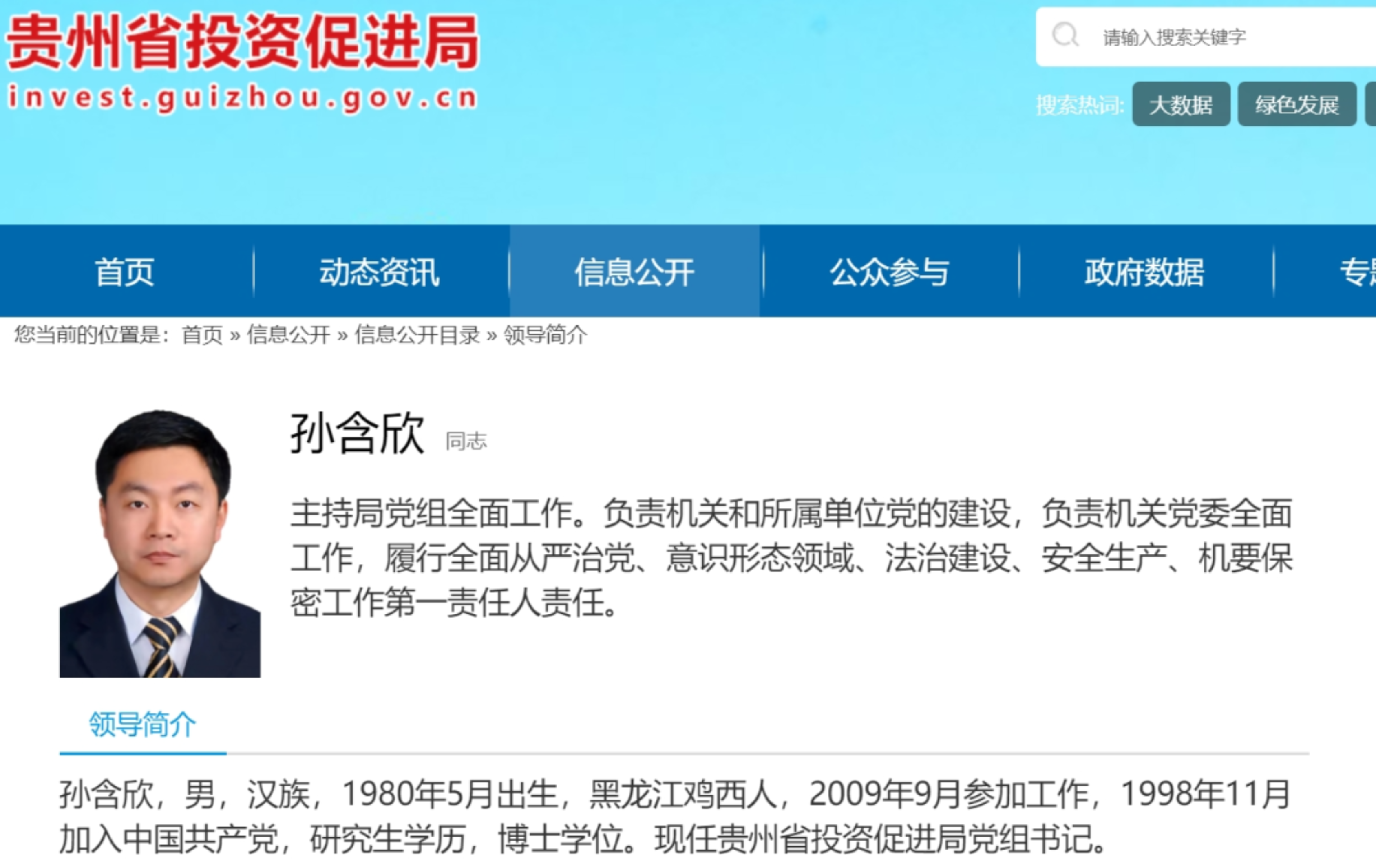 贵州省投资促进局网站“领导简介”一栏更新后显示,80后孙含欣已任该局党组书记,主持局党组全面工作。 此前,孙含欣为贵州省文化和旅游厅厅长。 图片来源:贵州省投资促进局网站 官网简历显示,孙含欣,男,...