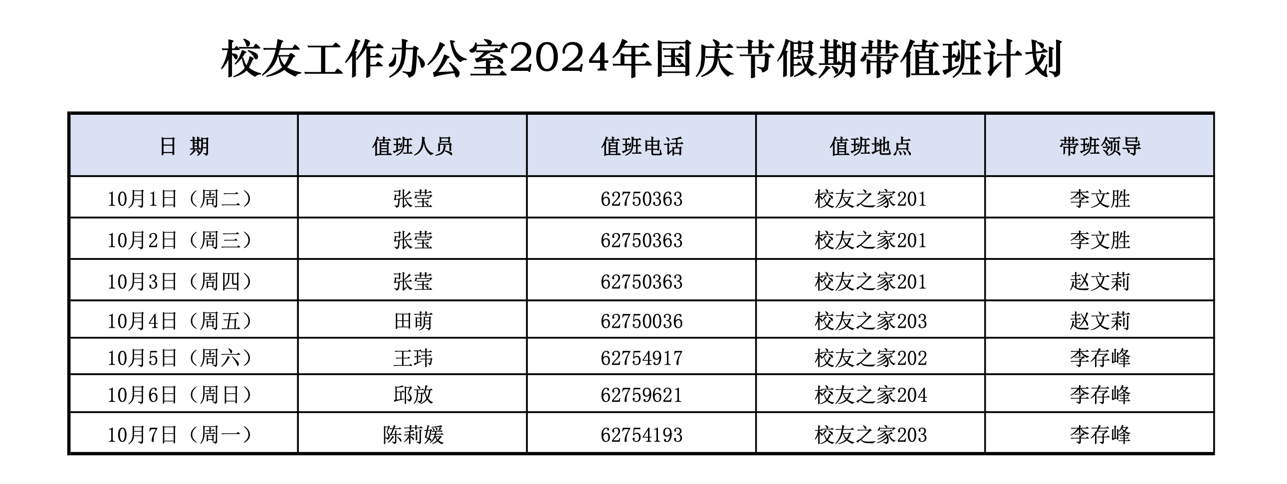 校友工作办公室2024年国庆节假期带值班表2024-09-23
