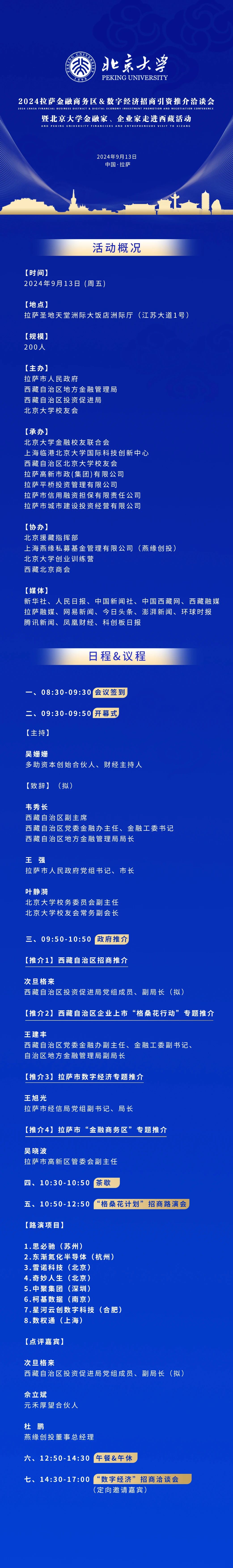 【活动报名】2024北京大学金融家、企业家走进西藏专题研讨&招商引资推介洽谈会活动报名 校友观众报名通道 非校友观众报名通道 温馨提示: 1、活动付费制参与(校友54元/人,非校友126元/人),费用包含两日活动入场资格,提供两日活动午餐,并附赠价值98元伴手礼(北京大学出版社《讲给... 2024-09-06