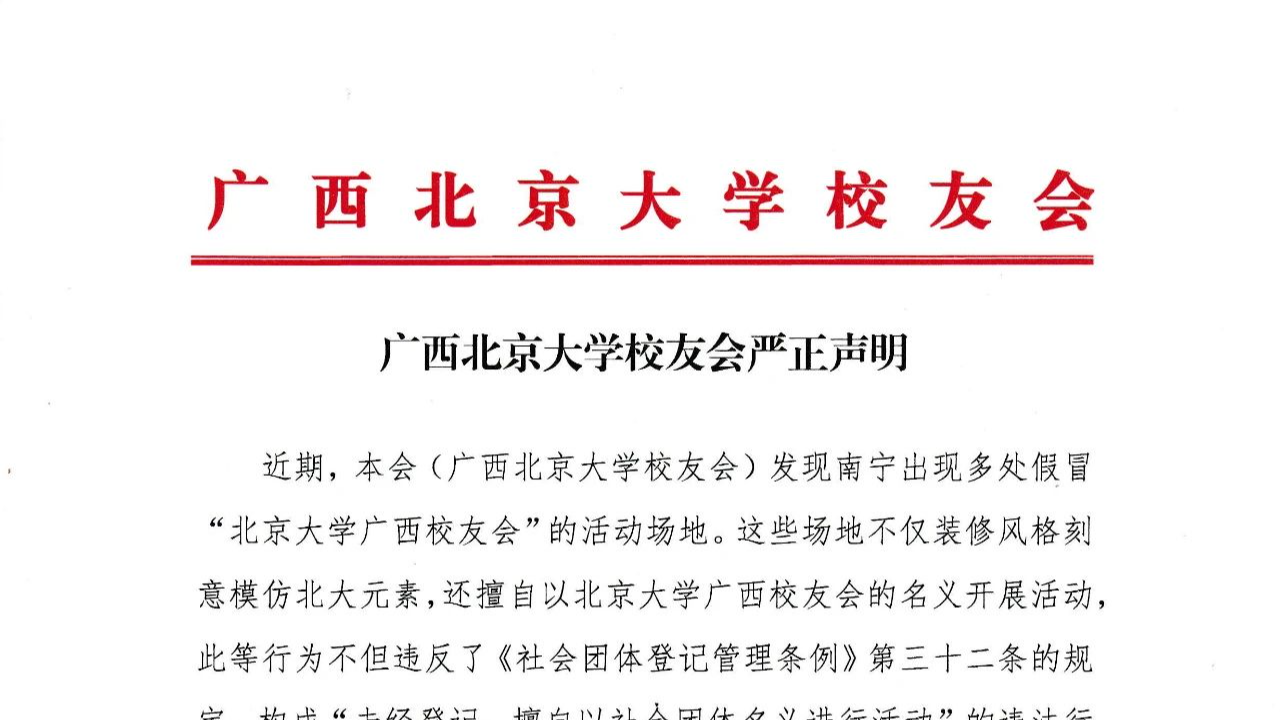 广西北京大学校友会严正声明近期,本会(广西北京大学校友会)发现南宁出现多处假冒“北京大学广西校友会”的活动场地。这些场地不仅装修风格刻意模仿北大元素,还擅自以北京大学广西校友会的名义开展活动,此等行为不但违反了《社会团体登记管理条例》第三十二条的规定,构成“未经登记,擅自以社会团体名义进行活动”的违法行为,应当依据《社会团体登记管理条例》、《中华人民共和国治安管理处罚法》的规定予以处罚,构成犯罪的,应当追究刑事责任。该... 2025-03-31
