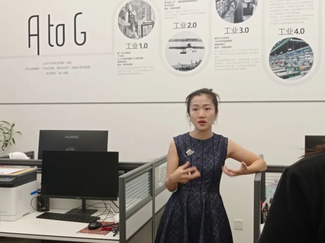 ATOG高级定制内衣创始人、医学部校友周滢滢热烈欢迎参访团的到来,并带领大家参观了从绘图设计区、面料配件区、手工制作间,到发货区的内衣智能高定全流程。