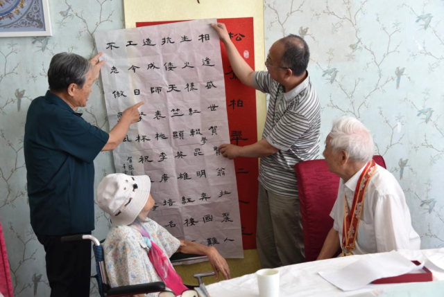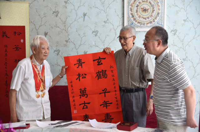 一同来看望张老的还有96岁高龄的陈庆道学长。陈学长1946-1949年在北大化学系学习,他曾组建北大理学院合唱团,团结进步力量,参加反内战、反迫害学生运动,迎接北平和平解放,毕业后来到大连,一直于化物所工作,退休前任大连化物所副所长。陈老和张老在沙滩红楼读书时曾住在同一个宿舍,陈老还是张老的入党介绍人。在祝贺张老百岁寿辰时,陈老还带来了自己撰写的寿联“玄鹤千年寿,青松万古春”。