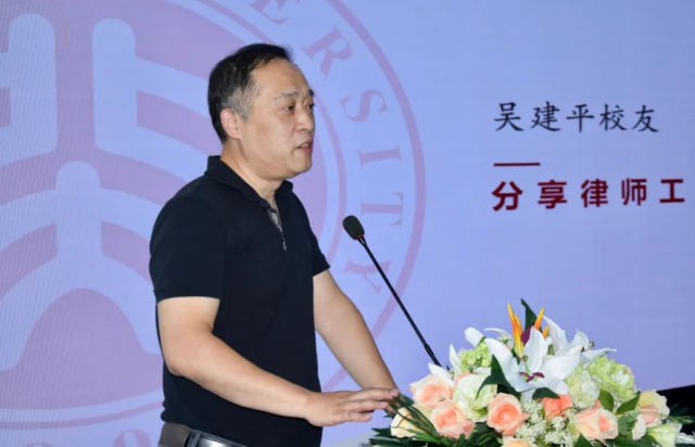 北京大学法学院1992届校友、辽宁省律师协会政府法律顾问委员会副主任、辽宁同方律师事务所高级合伙人吴建平向同学们介绍了自己的学习与工作经历。吴律师讲述北大带给他的最重要的两点感受,一是法律思维逻辑基础,二是舍我其谁、永不服输的精神。他希望同学们能够真正地理解并将这两个要点灵活运用于今后的学习和工作中。
