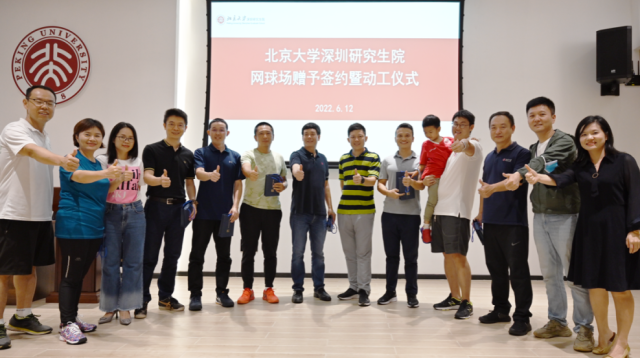 2022年6月12日下午,北京大学深圳研究生院网球场赠予签约暨动工仪式在六号楼负一层学生活动中心顺利举行。深研院师生、赠予方与施工方代表共聚一堂,在快乐、融洽的氛围中共同见证了网球场赠予签约及工程启动。本片网球场翻新改造后不仅为深研院在校师生创造了良好的运动条件,更以网球为纽带,促进交流,深化情谊,加强校友、在校生和教职工的融合凝聚。