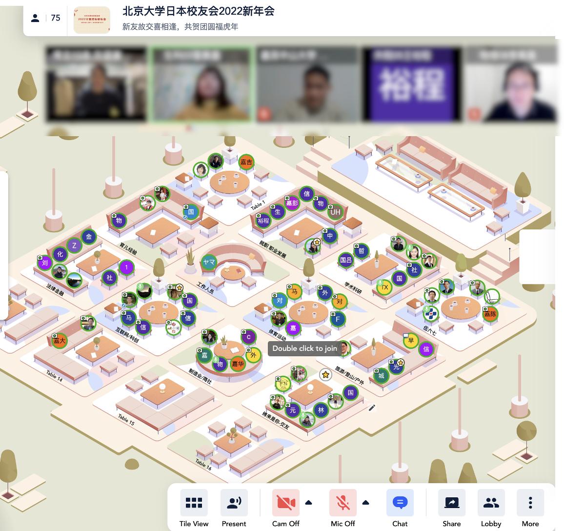 新友故交难得相逢,为使大家能畅快交流,除集体环节之外,本次新年会特别设置了“小桌自由交流”环节。新年会使用高度模拟线下聚会体验的在线聚会平台,在报名阶段提前收集校友们感兴趣的议题,在此基础上设置了“学术科研”、“职业发展”、“体育运动”等10个“主题交流桌”,便于志趣相合的校友们相识相聚,畅谈分享。此外,在线会场还设有多个自由交流桌,所有小桌均可自由出入。当晚,各桌讨论或妙趣横生,或温暖适意,或博学思辨,讨论气氛热烈,校友、嘉宾们积极分享着自己的故事和体会,通过小桌讨论碰撞出新的相识相知。