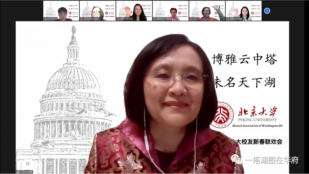 之后由吕玫介绍了近期北大华府校友会的“茶馆漫谈”活动。在活动中我们邀请到本地校友为大家分享,大到人生哲理天南海北,小到生活情趣小道消息。前两期的主讲崇艺农(81英语),侯真(85城环),和接下来要登上讲坛的王起云(63化学)和陈竞飞(79化学)给大家送上了新春祝福。