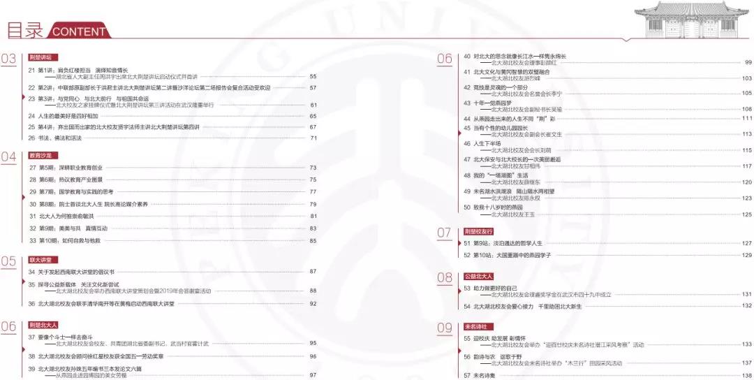 该期栏目由“会长办公会、精彩校友会、荆楚讲坛、教育沙龙、联大讲堂、荆楚北大人、荆楚校友行、公益北大人、未名诗社”九个板块构成,11万余字记录了北大湖北校友会近年来丰富多彩的美好瞬间和故事。在这里,您可以看到的不仅是校友会成长的心路历程,更是力透纸背的奋进铿锵,记忆和记载了几代人北大人在湖北当下最美的芳华。