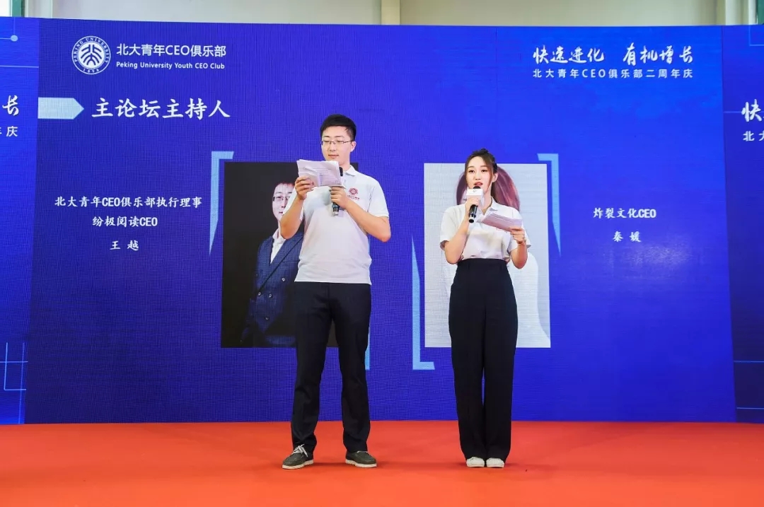 8月9日上午九点,北大青年CEO俱乐部二周年庆主论坛开幕,150余名嘉宾共聚一堂,共同探讨“快速进化”和“有机增长”,主论坛由北大青年CEO俱乐部副理事长、爱培优CEO张金荣和北大青年CEO俱乐部监事、朝财CEO王朝薇共同主持。
