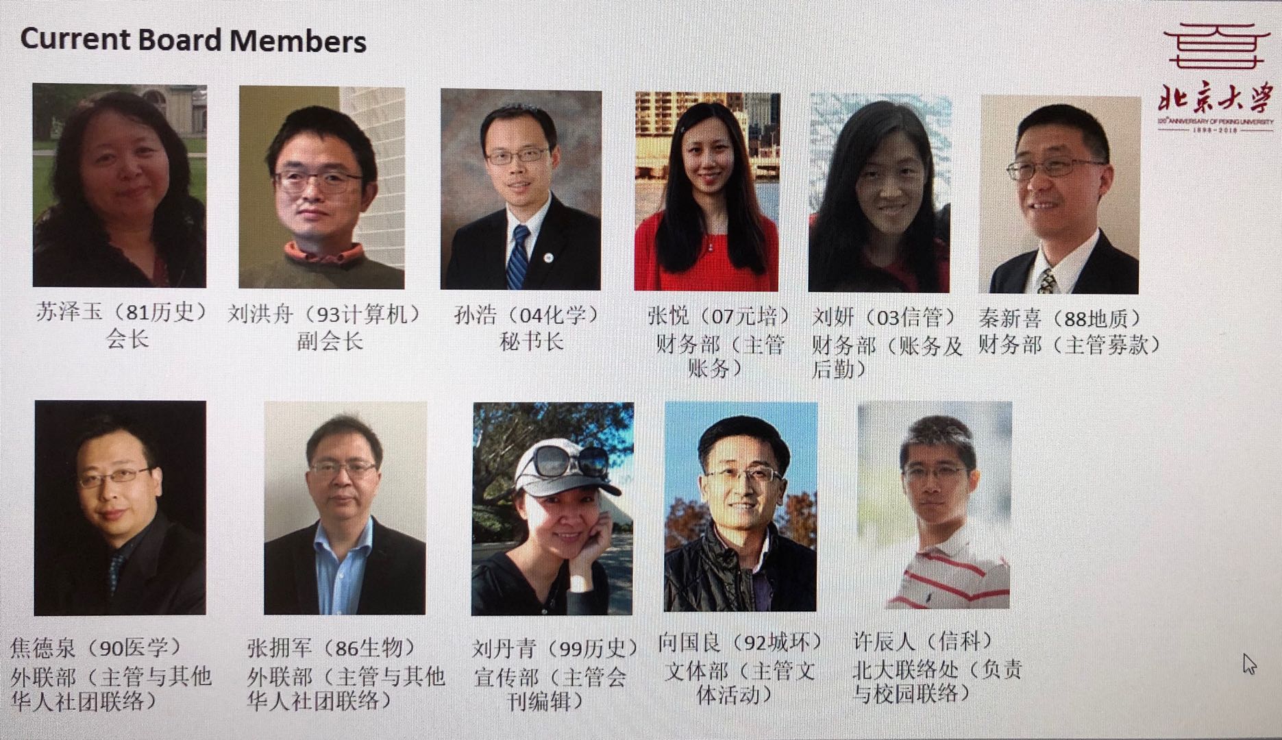 新一届的董事会暨管理团队包括了:会长:苏泽玉校友(81历史);副会长:刘洪舟校友(93计算机);秘书长:孙浩校友(04化学);财务官:张悦校友(07元培);以及,刘妍校友(03信管);秦新喜校友(88地质);焦德泉校友(90医学);张拥军校友(86生物);刘丹青校友(99历史);向国良校友(92城环);许辰人校友(信科)。参加会议的各位校友对新一届管理团队的成立表示祝贺,同时对离职的刘茜、田申两位校友做出的贡献表示由衷感谢。