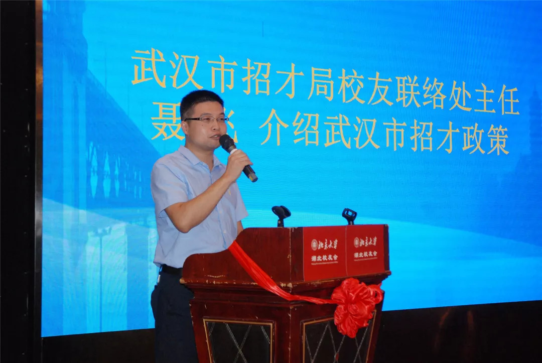 受武汉市招才局主要领导的委托,招才局校友联络处主任聂飞介绍了武汉市的招才政策,特别表达了对北大校友的青睐,表示武汉市近年来高度重视招才引才,提供了百万大学生精英留汉工程、保障性住房体系、创业补贴和融资扶持等优惠政策,希望能为回汉工作的北大校友提供最贴心服务和最宽松环境。