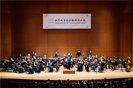 当晚的演出以《燕园情》作为开场。来自北京大学纽约校友会合唱团的校友身着纯黑礼服,在林肯中心舞台和灯光的映衬下格外优雅。“眼底未名水,胸中黄河月。”作为北京大学最广泛传唱的歌曲,《燕园情》的曲调一出,就牵起了在场校友深深的家国情、母校情。双甲子,北大情怀传承逾百年;越重洋,母校情谊不以山海远。身在万里之外的纽约,北大校友们依然心怀祖国心系母校,用自己的方式在世界之都为母校庆生。