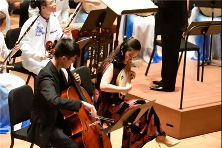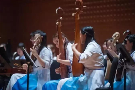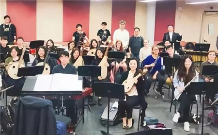 上半场的中国传统乐曲单元,北京大学民乐团的团员献上了四首民乐名曲。《光明行》和《良宵》均由中国著名二胡演奏家、作曲家、教育家、北京大学音乐传习所国乐导师刘天华先生创作。为庆祝北京大学120周年校庆,北京大学民乐团特邀著名指挥家、作曲家王甫建先生对这两曲进行重新编配,得到了观众的广泛好评。古筝协奏曲《渔舟唱晚》由北京大学民乐团李派演奏,古筝的自然洒脱与淳朴沉稳将这首古曲表现得淋漓尽致。柳琴与大提琴协奏曲《梁祝》将东方古老的民间爱情故事带到了纽约,禹洁的柳琴演奏与ChrisGao的大提琴完美结合,每一曲结束都获得了观众经久不息的掌声。
