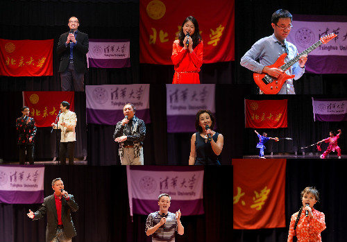 在两校亲如一家的欢快气氛中,北大校友朱砂、马欣悦、王昀初献上一首《La La Land Medley》,声情并茂的歌声,优雅灵动的舞姿,美不胜收。清华北大校友二代的武林小子姑娘们,腾挪跳跃,刀光剑影,充满了活力。清华校友刘渊满怀深情演唱的由清华校友古丽蓉作词、Peter Gao谱曲的新歌《青春》让在场校友感叹,岁月流逝,难忘的仍然是我们永不退色的青春!北大校友罗勇、鲍一明自编自演的相声《鸡年说鸡》演出中出现了戏剧性的忘词,台下师妹急遣小朋友送台词解围,给大家带来了意外的无穷欢乐。而清华校友胡文胜演唱的《睡在我上铺的兄弟》,“睡在我上铺的兄弟,睡在我寂寞的回忆,你说每当你回头看夕阳红,每当你又听到晚钟,从前的点点滴滴会涌起”,让校友们怀念母校,跨越时空,穿越北大清华学生宿舍,仿佛在跟自己的舍友喃喃对话。北大校友刘骥清新亮丽的吉他独奏犹如一湾清泉流淌在校友的心田里。清华校友王宏模深情朗诵了校友古丽蓉的新作,“所有的过去,都留下痕迹,所有的痕迹,都写进了记忆。” 这过去的痕迹“哪怕是一次”,也轻轻地拨动了校友的心弦,即使只是“最微妙的心动”。由北大校友郑立欣、沈大勇、陈竞飞、罗勇、王秀新、王信东和张国威演出的歌曲联唱《北风吹》、《共享幸福》、《蒙古祝福歌》和《欢乐中国年》让所有来晚会的校友和他们的亲人,不分男女老幼分享了一个轻松愉快的鸡年新春之夜。