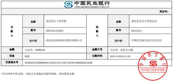 北大湖北校友会鹏程教育基金设立后,荆楚北大人再掀捐资助学热潮,在王吉、周卫军两位校友捐款后,2016年12月13日,北大湖北校友会副会长、武汉设计学院董事长董事长程凡向校友会捐款10万元。