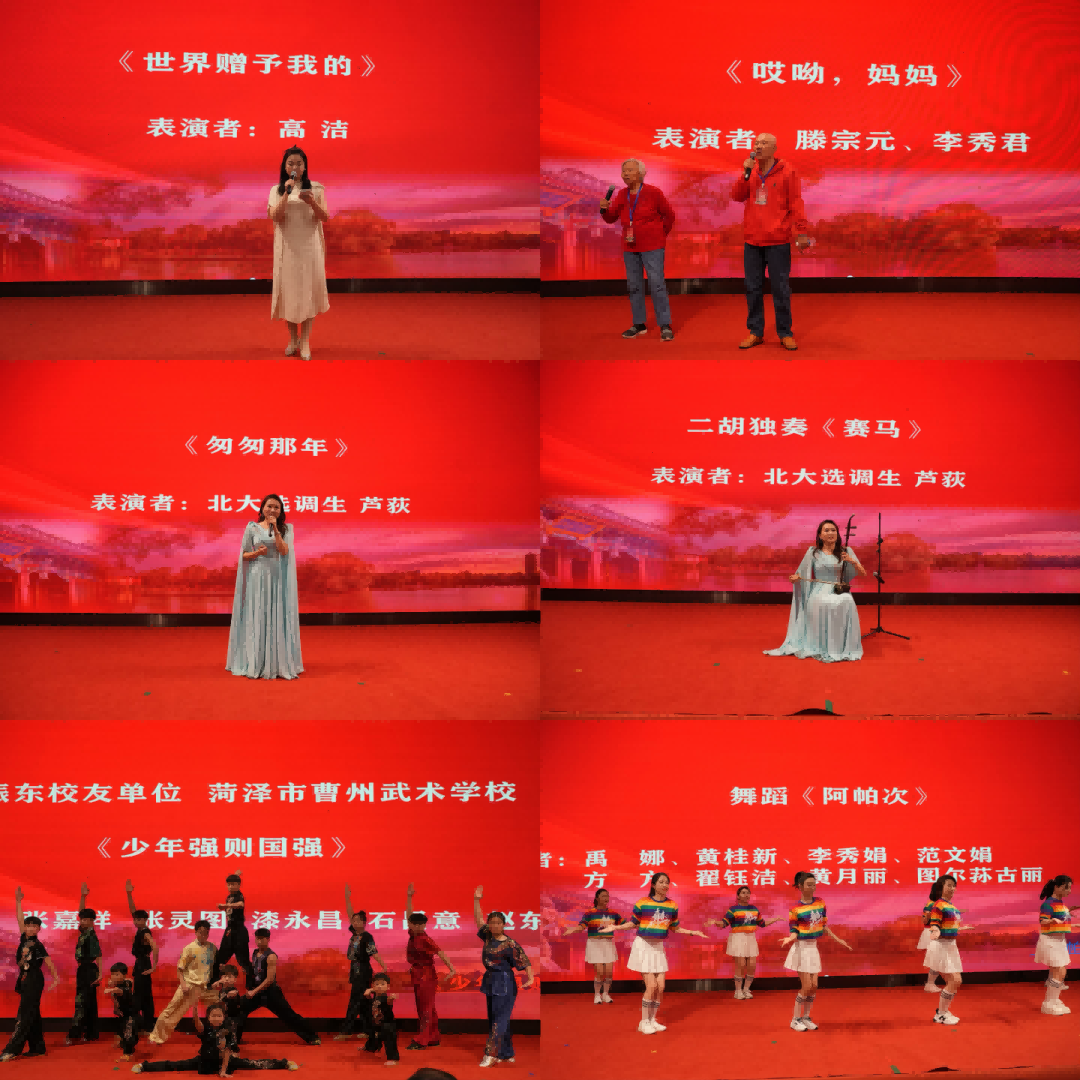 联谊活动中,校友们准备了精彩的文艺节目:高洁校友演唱《世界赠予我的》;芦荻校友带来二胡独奏《赛马》并演唱《匆匆那年》;山东菏泽曹州武校带来武术表演《少年强则国强》;已80岁高龄的滕宗元、李秀君校友演唱《哎呦,妈妈》;禹娜、黄桂新等校友带来舞蹈《阿帕次》;拾光合唱团的9位校友代表倾情合唱《萱草花》。