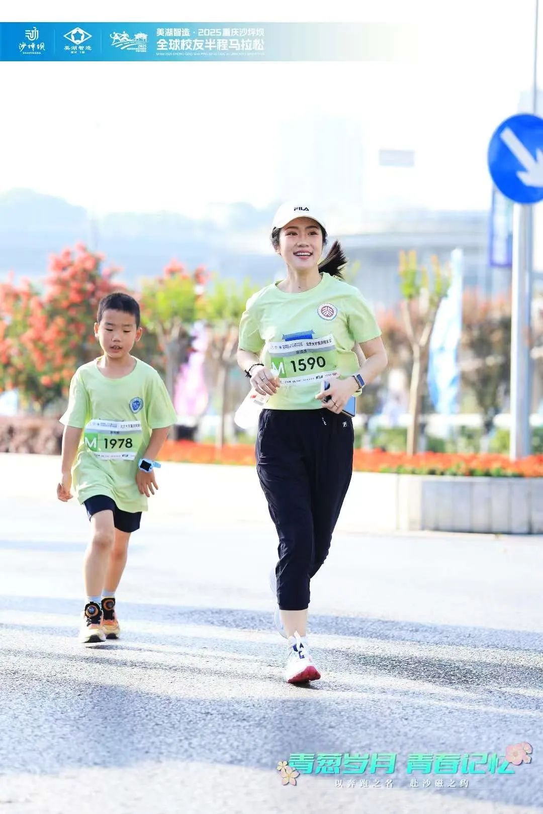 特别引人注目的是,2017级光华管理学院蔡润维、2019级外国语学院杨睿两位重庆籍校友专程从北京返渝参赛。“用脚步丈量家乡土地,用汗水致敬燕园精神”,蔡润维在完成半程马拉松后动情地说。在渝校友,2009级新闻传播潘先珮不仅积极报名参赛,还为北大参跑团购买了北大标志贴;2003级医学和国际关系专业周滢滢如今已是两个孩子的宝妈,今天她带着两个孩子十分享受地参赛。不同校友加入参跑团体现了北大校友对母校精神的地域传承。