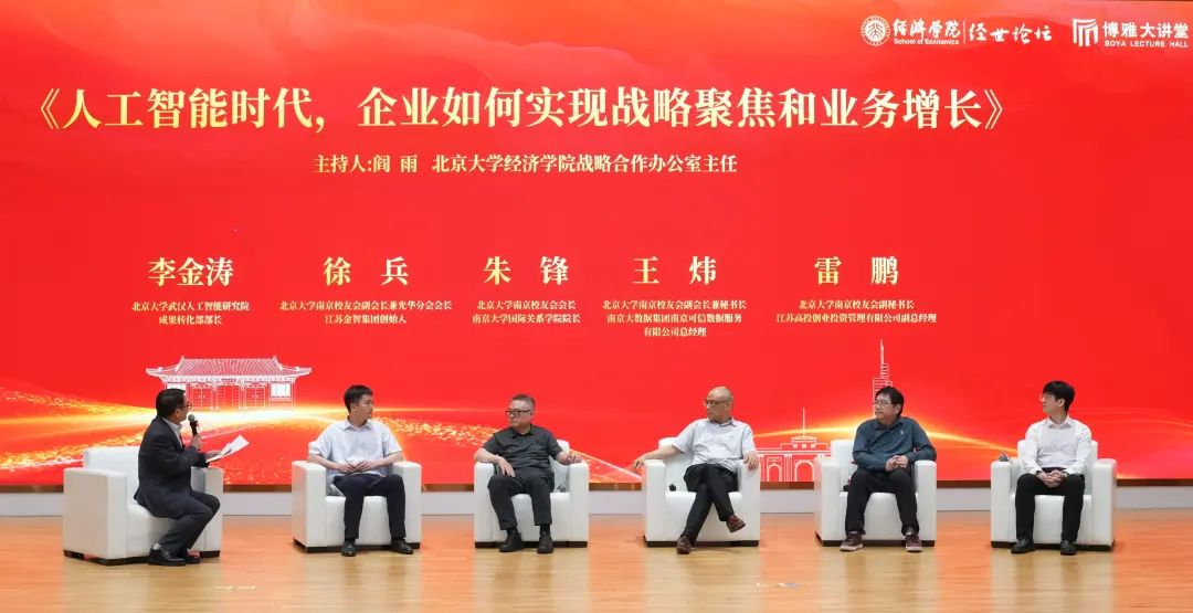 圆桌对话环节,以《人工智能时代,企业如何实现战略聚焦与业务增长》为主题,朱锋、李金涛、王炜,北京大学南京校友会副会长兼光华分会会长、江苏金智集团创始人徐兵,北京大学南京校友会副秘书长、江苏高投创业投资管理有限公司副总经理雷鹏作为嘉宾,由北京大学经济学院战略合作办公室主任阎雨主持,大家围绕人工智能时代企业转型的关键问题展开热烈讨论,碰撞出智慧的火花。