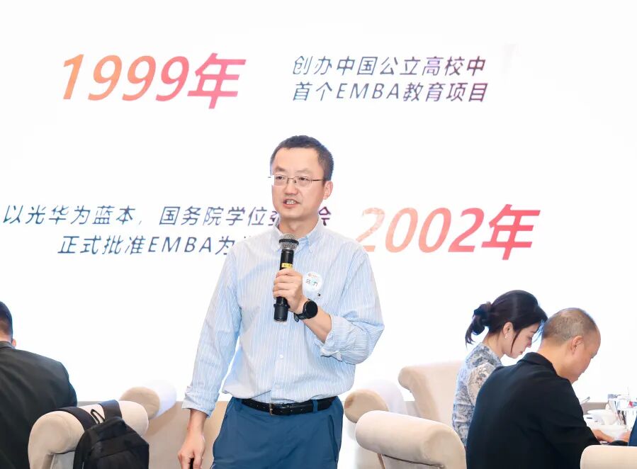 学院副院长马力系统介绍了EMBA项目25年来的办学成果,阐释了"科学思辨、超势前瞻、知行合一、敢当无我"的育人理念。