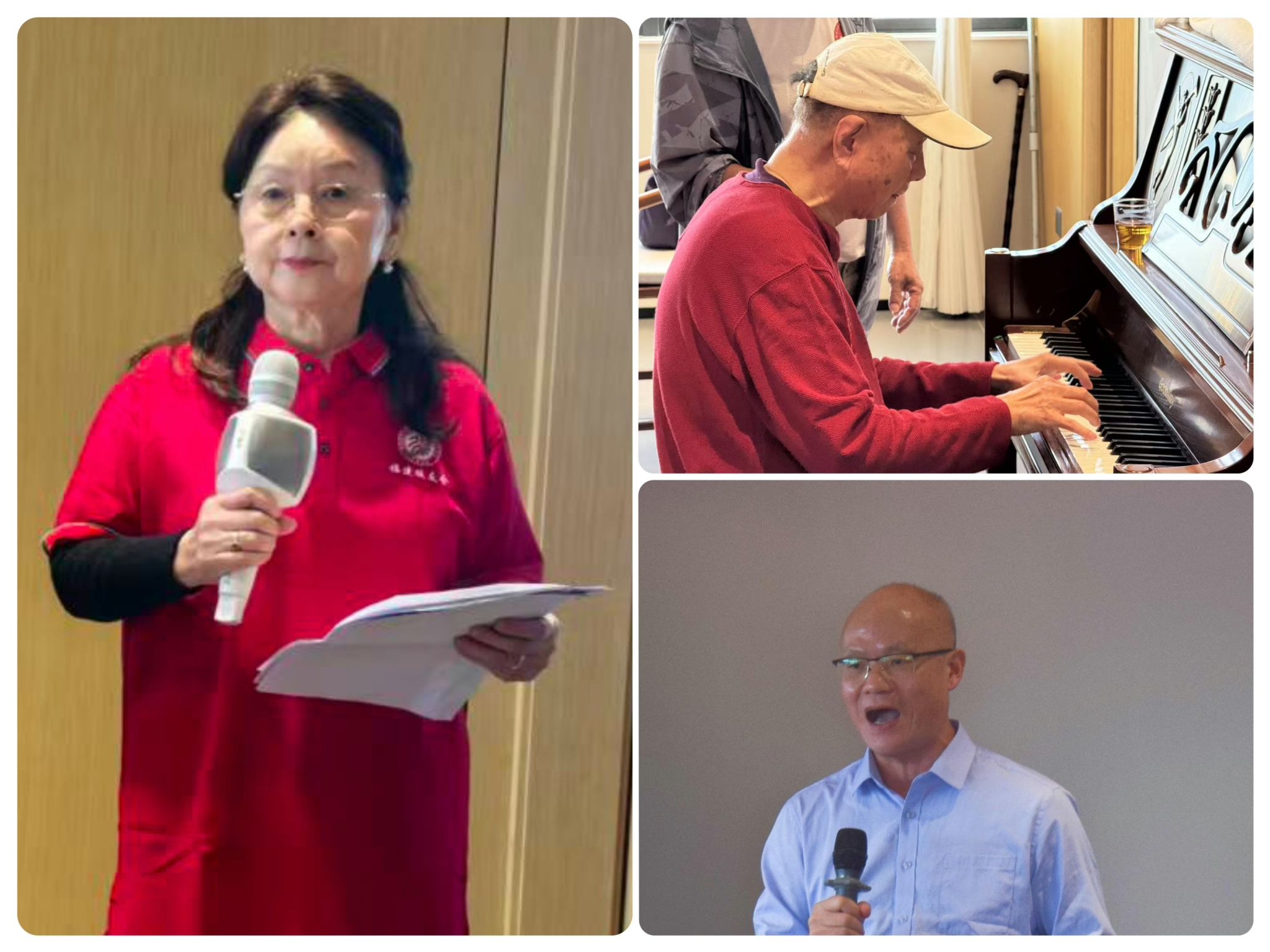 随后,琴声与歌声将活动气氛推向了新的高潮。赵玉生校友端坐于钢琴前,一曲《梁祝》如泣如诉,一曲《牧民之歌》奔放辽阔,悠扬的琴声在北大人之家回荡,诉说着六十年光阴的故事。琴声未落,歌声又起,丁友玲校友引吭高歌,《我像雪花天上来》空灵悠远,《鼓浪屿之波》满怀深情,歌声感染了在场的每一个人。胡解新校友也登台献唱,用《我的中华》为这场盛会增添了艺术的光彩。