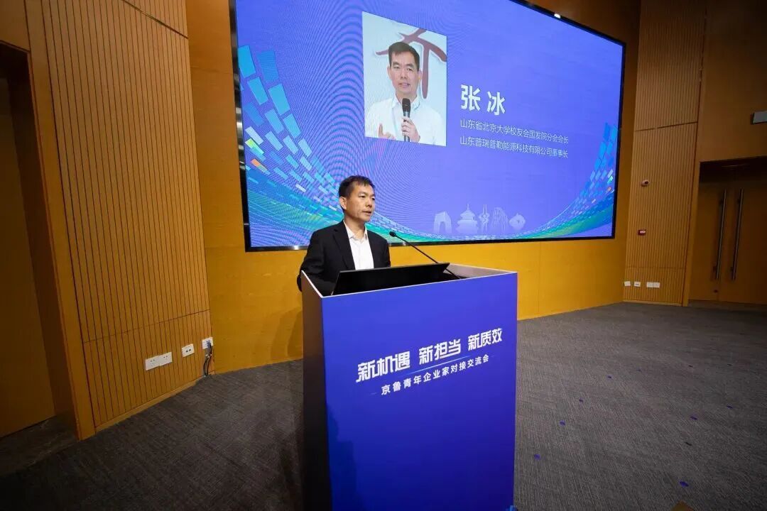 在交流发言环节,山东省北京大学校友会国发院分会会长、山东普瑞普勒能源科技有限公司董事长张冰,代表山东校友表达了“回家”的喜悦之情,深情回顾了在国发院的求学岁月。分享中,他援引了周其仁老师关于“科技创新就要有高浓度、高密度的场”的深刻见解,强调在国发院这个独特的“场”里,不仅每一位老师和同学都出类拔萃,更形成了强大的群体效应:大家相互激发、彼此扶持、共同进步。他代表山东北大校友会和山东北大校友会国发院分会欢迎驻京青年企业家们多“回家”看看。