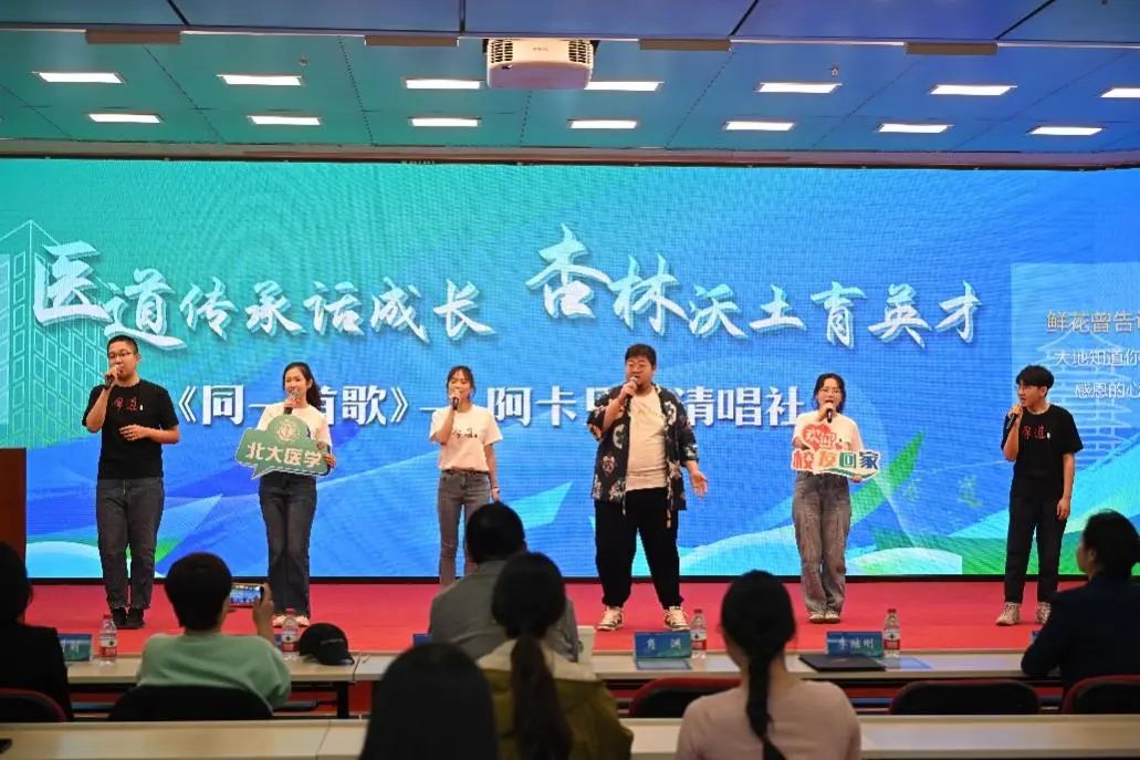 活动伊始,北京大学医学部阿卡贝拉清唱社献上一曲《同一首歌》欢迎校友们回家。“亲爱的校友欢迎你们回家来探望,明天的北医必将创造新的辉煌……”真挚的歌词与抒情的曲调表达了北医学子对校友们真诚而热烈的欢迎,以及对北医创造新辉煌的美好祝福。