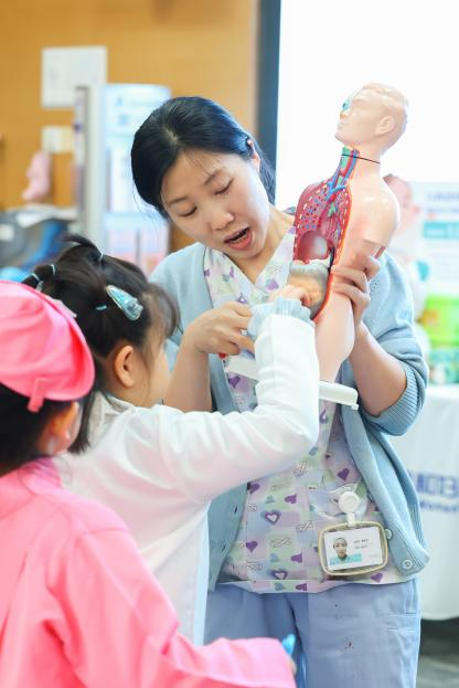 活动期间,儿科护士长彩红演唱《七步洗手歌》,为小朋友们演示正确的洗手方法,教导科学的洗手方法,并提醒大家日常注意保持手卫生和咳嗽礼仪等良好的卫生习惯。接着,长彩红利用器官模型,引导摆放在相应的位置,帮助小朋友们了解身体的奥秘,让小朋友们更直观地理解人体的结构和功能,由此学会爱惜自己的身体。