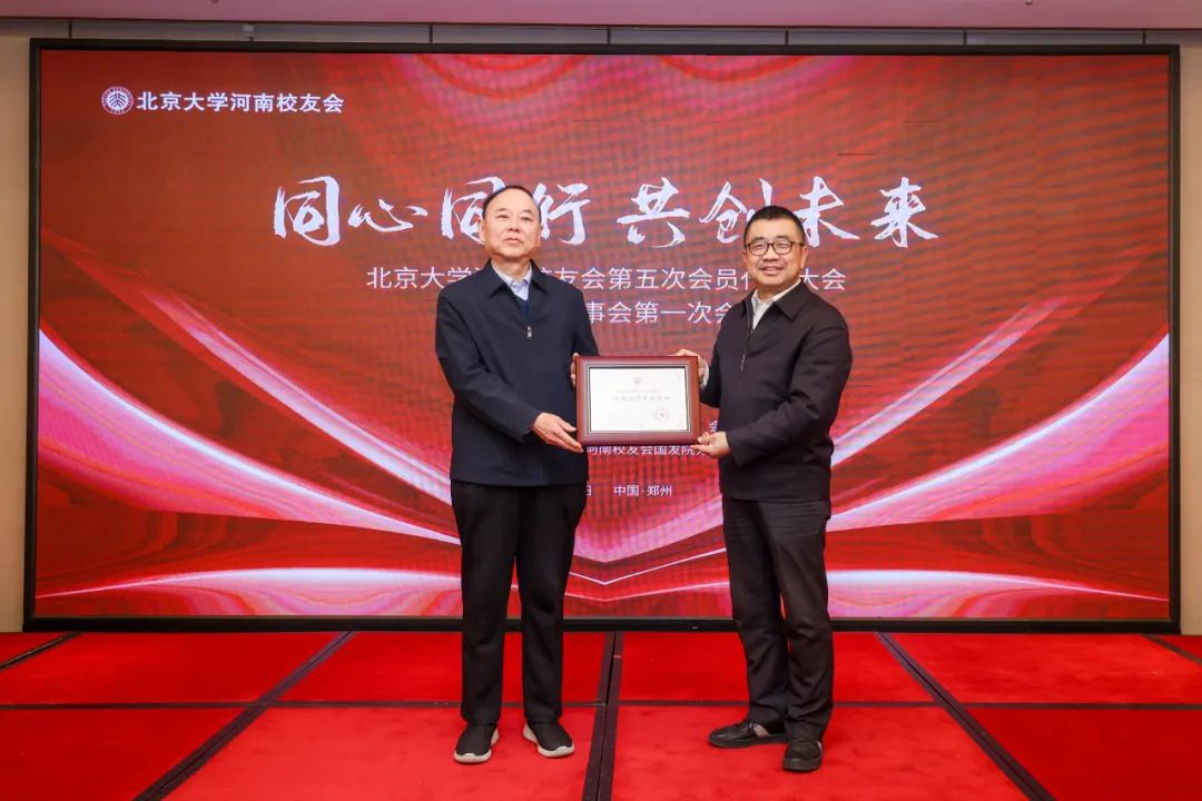 会议期间,李文胜代表北京大学校友会向河南校友会颁发2019-2022年度“北京大学优秀校友组织”获奖证书,并向获得2019-2022年度“北京大学优秀校友”“北京大学校友工作贡献奖”“北京大学优秀校友工作者”的张超、代冲、王留义3位校友颁发获奖证书。
